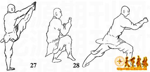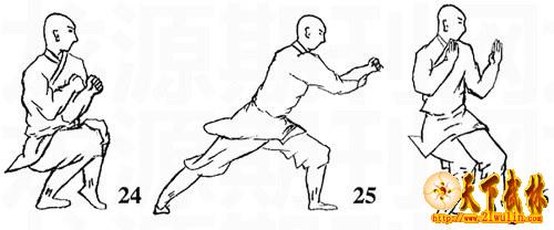 3.金刚倒锥 接上势,右拳、右足同时收回,右拳由胸向下捣于左掌心,右足用力向下踩成并步。身随踩脚下蹲。力达足跟、拳背,左掌心向上,右拳心向上,目视右拳(图10)。 4.纵身云顶 接上势,起身,向右纵转,左足稍抬,落左足跟上右足成右弓步,右拳成掌,两掌向右画弧,左掌收于胸前,右掌再由颚下向前发出,力达掌沿。左掌心向上,右掌沿向前,目视右掌(图11)。 5.单鞭 接上势,右掌收于胸前成拳,身向左转,左足稍抬,落左足成左弓步,左拳由颚下向前、右拳由右耳向后同时发出,力达拳面。左拳心向下,右拳眼向上,目视左拳(图12)。 6.七星 接上势,两拳由下收于胸前,左足稍抬。落左足成左弓步,两拳由颚下内翻同时向前发出,力达拳面。两拳面向前,目视两拳(图13)。 7.云顶挎弓 接上势,右拳成掌由头右侧向左画弧,左拳成掌紧跟由左向右画弧,收左足,身向右拧转下蹲。右掌由左掌内侧抽出反架于头上方,左掌向下劈于左足外侧,力达掌沿。左掌沿向下,右掌沿向上,左足尖点地,目视左掌(图14)。 8.摆莲斜行 接上势,起身,左足向右上半步,两掌收于胸前,身向右转,右足由里向外摆,两掌由颚下由外向里不同时地拍击右足面,两掌心向下,右足面绷直,目视右掌、足(图15)。 接上势,两掌收于胸前成拳,落右足成右弓步,左拳由颚下向前、右拳由右耳向后同时发出,力达拳面。左拳面向前、右拳眼向上,目视左拳(图16)。 9.七星 接上势,两拳由下收于胸前,右足稍抬,落右足成右弓步,两拳由颚下内翻向前发出,力达拳面。两拳面向前,目视两拳(图17)。 10.云顶挎弓 接上势,左拳成掌由头左侧向右画弧,右拳成掌紧跟由右向左画弧,收右足,身向左拧转下蹲,左掌由右掌内侧抽出反架于头上方,右掌向下劈于右足外侧,力达掌沿。左掌沿向上,右掌沿向下,右足尖点地,目视右掌(图18)。 11.三出手 接上势,起身,两掌收于胸前,上右足成右弓步,同时由颚下向前发右掌,力达掌尖,左掌收于颚下。两掌心向上,目视右掌(图19)。 接上势,身向右转,上左足成左弓步,由颚下向前发左掌,同时收右掌于胸前,力达掌沿。左掌沿向前,右掌心向上,目视左掌(图20)。 接上势,两掌收于胸前成拳,两足不动,身向左拧转,左拳由左耳向后、右拳由颚下向前同时发出,力达拳面。左拳眼向上,右拳面向前,目视右拳(图21)。 12.磨身云顶 接上势,两拳由下收于胸前成掌,身向右拧转,上右足成右弓步,两掌由颚下由外向里画弧于胸前,右掌再由颚下向前发出,力达掌沿。左掌心向上,右掌沿向前,目视右掌(图22)。