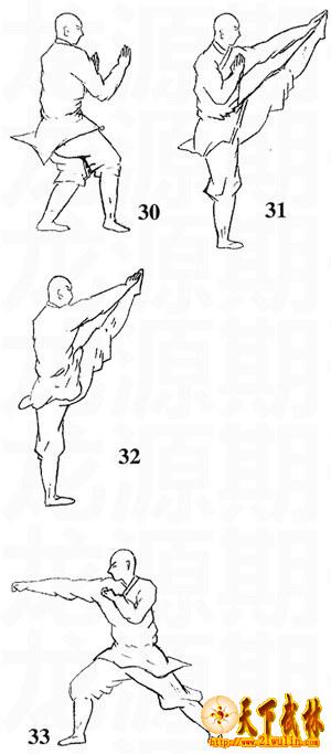 13.单叉 接上势,右掌收于胸前,身向左转,左腿向前伸直落地,右腿屈膝落地成单叉,两掌指向上,左足尖向上,右足尖向右,目视前方(图23)。 14.挑手 接上势,起身,上右足,跟上左足,两掌由外向里抓于胸前成拳,身随抓带左足稍收,身稍下蹲,两拳眼向上,连贯动作(图24)。 接上势,起身,上左足成左弓步,右拳心托左小臂向前上方挑去,力达拳面。左臂屈肘,左拳挑于肩平,左拳眼向上,右拳心向上,目视左拳(图25)。 15.踩脚 接上势,两拳由上向下护膝再向上画弧收于胸前成立掌,同时收左足成左虚步,身稍下蹲。两掌指向上,左足尖点地,目视前方(图26)。 接上势,起身,左掌由颚下向外抓于胸前成拳,同时向前飞踢右足,右掌由颚下向前拍击于右足面。左拳面向上,右掌心向下,右足面绷直,目右视掌、足(图27)。 16.挑手 接上势,落右足,收右掌于胸前,上左足,跟上右足,两掌由外向里抓于胸前成掌,身随抓带右足稍收,稍下蹲。两拳眼向上,动作连贯(图28)。 接上势,起身,上右足成右弓步,左拳心托于右小臂向前上方挑击力达拳面,右臂屈肘,右拳挑于肩平。左拳心向上,右拳眼向上,目视右拳(图29)。 17.二起脚 接上势,两拳由上向下护膝再向上画弧于胸前成立掌,同时收右足成右虚步,身稍下蹲。两掌指向上,右足尖点地,目视前方(图30)。 接上势,起身,向前飞踢左足,左掌由颚下向前拍击于左足面。左掌心向下,右掌指向上,左足面绷直,目视左掌、足(图31)。 接上势,左掌收于胸前,再落左足向前飞踢右足,右掌由颚下向前拍击于右足面。左掌指向上,右掌心向下,右足面绷直,目视右掌、足(图32)。 18.反背秀手 接上势,身体左转,落右足成右弓步,右掌收于胸前成拳,左掌由颚下向外抓于胸前成拳,同时由颚下向前发右拳,力达拳面。左拳心向上,右拳面向前,目视右拳(图33)。 接上势,左足向右足后偷一步,身向左转,收右拳于胸前,左拳成掌由颚下向外抓于胸前成拳,收左足,身随转抓下蹲。两拳面向上,右足尖点地,目视前方(图34)。 19.火塞炮 接上势,起身,上左足,跟上右足成并步,左拳由颚下向前上方扬发成掌,同时右拳由颚下向前击于左掌心,力达拳面。左掌心向下,右拳心向下,目视掌、拳(图35)。 接上势,掌、拳收于胸前,上左足,跟上右足,身稍下蹲,同时左掌成拳向上架于头上方,右拳由颚下向前发出,力达拳面。左拳眼向下,右拳心向上,右足尖点地,目视右拳(图36)。 20.反步拉木 接上势,两拳收于胸前成掌,身体向右拧转,抬右足,左掌收于胸前,右掌劈于右足外侧,力达掌沿。左掌指向上,右掌沿向下,右足尖上翘,目视右掌(图37)。 接上势,落右足,抬左足,身体向左拧转,右掌收于胸前,左掌由颚下劈于左足外侧,力达掌沿。左掌沿向下,右掌指向上,左足尖上翘,目视左掌(图38)。 21.秀手 接上势,左掌收于胸前,左足向前纵跳,右足紧跟向前纵跳,左掌由颚下向外抓收于胸前成拳,右掌成拳,身随纵跳下蹲。两拳面向上,右足尖点地,目视前方(图39)。 22.拗步冲捶 接上势,上左足成左弓步,左拳成掌由颚下向外抓收于胸前成拳,同时由颚下向前发右拳,力达拳面,身随发拳向左拧转。左拳心向上,右拳面向前,目视右拳(图40)。 23.云顶挎弓 接上势,右拳成掌由头右侧向左画弧,左拳成掌紧跟由左向右画弧,收左足,身向右转下蹲。右掌由左掌内侧抽出,反架于头上方,左掌向下劈于左足外侧,力达掌沿。左掌沿向下,右掌沿向上,左足尖点地,目视前方(图41)。 24.摆莲斜行 接上势,起身,左足向右上半步,两掌收于胸前,身向右转,右足由里向外摆,两掌由颚下由外向里不同时地拍击于右足面。两掌心向下,右足面绷直,目视右掌、足(图42)。 接上势,两掌收于胸前成拳,落右足成右弓步,左拳由颚下向前、右拳由右耳向后同时发出,力达拳面。左拳面向前,右拳眼向上,目视左拳(图43)。