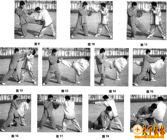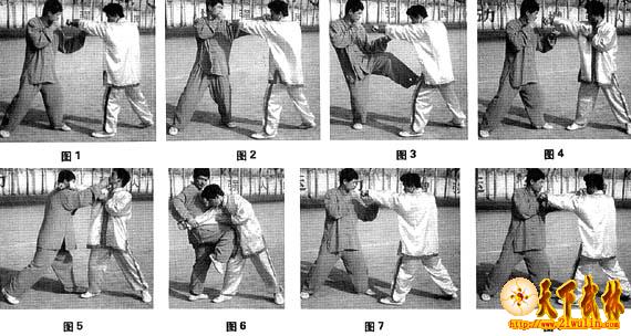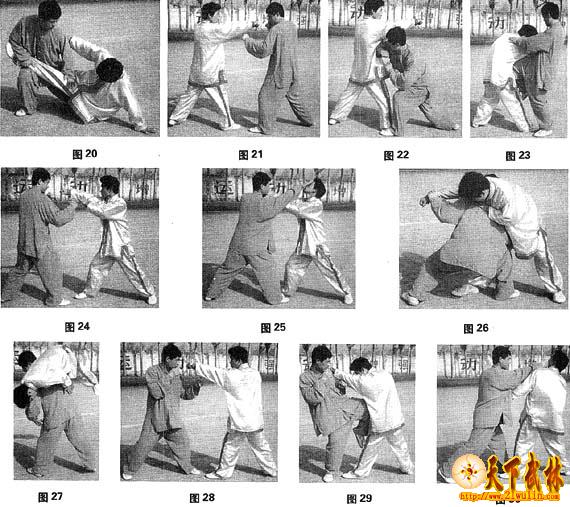 示例三:实战打斗中,我以左势与敌对峙,对方突然进左步用左拳欲攻击我面门(图7),我与敌同动,左脚疾进,右手迅速向右封挡来拳,同时用左拳猛击对方面门,形成迎击(图8),动作不停,右脚垫步,起左腿迅猛侧踹对方腹部(图9)。 应用提示:此式属拳法迎击腿法连打技法。用时我不躲不让,右封左打,封打同时,一击中的;侧踹技术由提膝、展髋、踹击构成,踹击时通过腰向右骤然拧转,使髋前送,发挥全身整体劲,增加踹击力量。 示例四:实战打斗中,我以左势对手以右势对峙,对方突然前滑步用右拳猛击我面门(图10),我与敌同动,上体略后闪,同时起左脚迅猛戳踢对方右小腿胫骨(图11),形成迎击。动作不停,左脚顺势前落至对方右脚外侧,右脚跟进,左手从对方右臂外侧向下搂按其右臂,同时用右拳猛击对方面门(图12)。 应用提示:此式属腿法迎击拳法连打技法,踢击时,我目视对方两眼,隐蔽起腿,瞬间抖腿发力,劲意冷脆;搂手冲拳,贵在拧腰送肩,劲达拳面,前后两个动作要连贯协调,迅猛突然。 示例五:实战打斗中,我以左势对敌对峙,对方突然起左腿侧踹踢击我头部或胸部(图13),我右脚迅速向右前方垫步,身形略右闪,同时起左脚从对方身后撩踢对方裆部(图14),动作不停,我左脚顺势前落,右脚跟进,两手迅猛前扑对方肩背部或头背部,将其扑出(图15、16)。 应用提示:此式属腿法迎击扑撞连打技法。在闪避来腿攻击的同时,利用步法的灵活性进入到对方的防守死角发起迎击攻势,体现一个“巧”字;扑撞时要充分发挥自身的整体合力,突出整体爆发力。 示例六:实战打斗中,我与对手均以左势对峙,对方突然前滑步欲用左直拳攻击我面门(图17),我与敌同动,两腿疾步向前,左脚踏入对方中门,屈膝下蹲,左手插裆从里向外抱住对方左腿根,右手从外向里搂住对方的左小腿,头部左侧贴紧对方身体左侧,左肩顶贴对方腹部,胸部贴紧对方左大腿(图18),然后身体略起,两手急速向后拉拽对方左腿(图19),动作不停,右脚垫步,左腿顺势插别于对方右腿后侧,同时身体右转,两手继续回拉,拧腰发力,将其摔倒(图20),动作不停,左手背顺势弹打对方面门或用左拳猛击对方裆部。 应用提示:此式属摔法迎击掌法连打技法。其拳快要近身之时,俯身抱腿,拉拽插别,一气呵成;对方倒地,不等其还过神来,随即抖掌弹打其面门或用拳击其裆部,连打转换体现一个“活”字。 示例七:实战打斗中,我以左势对手以右势对峙,对方突然疾步前滑欲用右拳猛击我面门(图21),我与敌同动,两脚迅速向左前方滑进,屈膝向左下方闪避,同时用右肘横击扫撞对方胸肋部(图22),动作不停,我两手迅速变势抓捋对方右臂,起右膝迅猛撞击对方腹部(图23)。 应用提示:此式属肘法迎击膝法连打技法。用时要思维敏捷,判断准确,启动突然,闪避近身,脚到肘落;接下来上带把下撞膝,用力重脆。 示例八:实战打斗中,我与对手均以右势对峙,对方突然前滑步欲用右拳攻击我面门(图24),我与敌同动,两脚疾步滑进,左手由对方右臂内侧擒抓其右手腕,右手用五指戳击对方面门(图25);动作不停,我右脚迅速踏入对方中门,身体下潜,同时头部钻入对方右腋下,右臂穿入对方裆中(图26),继而,我迅速将对方挑起,并将其向左侧摔于地面(图27)。 应用提示:此式属指法迎击摔法连打技法,用时出手即直取对方面门,一捅即收,缩身下潜,脚手同动,穿入对方裆中,将其挑起,继而将其重摔于地下;两式动作要流畅,连接要紧凑。 示例九:实战打斗中,我与对手均以左势对峙,对方突然前滑步用左拳猛击我面门(图28),我与敌同动,右脚垫步,身形略右闪,同时起左膝猛击对方腹部,形成迎击(图29),动作不停,我左脚前落,左手顺势擒抓对手左臂,同时用右拳猛击对方头部(图30)。  应用提示:此式属膝法迎击拳法连打技法。对方在进攻时,其胸腹已变得最为脆弱,我膝法则势短力雄,可以短制长;接下来的连打快击,则出敌意料,对方来不及防范而遭重创。