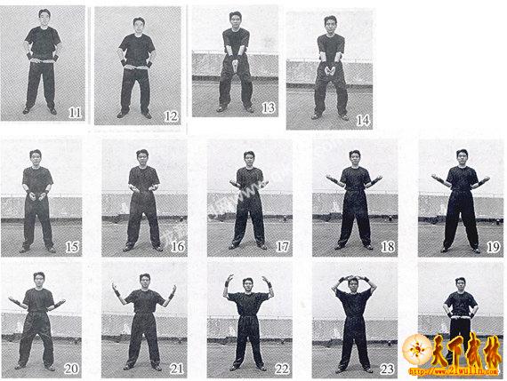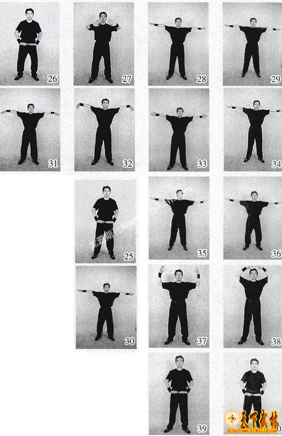 闭气要自然,嘴鼻要自然,身体要自然,神意要自然。不要强力憋气,保持住闭气前原有力度、意识即可,身体运动也不必因此加力使劲、妄加乱念。 初练闭气时,初学者往往不适应,或有气短、胸闷、头晕、头涨等不适,可以通过加快动作、减少力度、练短呼吸、闭少气息等方法解决,功夫深了自然适应。 5.随即向下用力缓按两掌,掌心向下不变;同时开始用鼻呼气,呼气要缓慢、均匀、适力,呼气与按掌力量、速度相合一致,丹田贯力(即下腹随按掌之形、呼气之势逐渐内合、收紧、生劲、通力)(图8、9)。 6.鼻呼不停,下按不停,臂腕渐渐加力,丹田贯力渐渐增强,待双掌按至下腹前(双臂适曲)停止呼气。此时呼气度、双掌下按力、下腹内合力共同达到峰值(图10)。 停止呼气后,喉间立即咽气一下(喉头向下翻动,适度用力,舌牙嘴配合,如咽东西,意念觉得气咽到丹田,短促自然)。咽气后不可随意再行呼吸,要待练习下式时方可开口吸气。 初习者不必全力,健身者不必用力。练习者要自行掌握强度,以自感适应为度。但须韧性使力,缓慢加力,渐渐加力,不可过急,不可过猛。学者要多加体悟“丹田韧性”的妙用和使力方法。 初习本式,两臂骨节不见响动,且酸痛异常;习久功深,则骨节啪啪作响,气随意注,顿觉腹坚如石,手劲臂力加增。 注意:用嘴吸气时双掌不用力,用鼻呼气时双掌用力。“不用力”,是指不必再刻意加力,但也不是无力,还得有一定的力度;“用力”,就是在一定基本力的基础上,再适度加大用力,目的是通过用力锻炼来增强功力。 吞吐功以下几式里有与本式类同的练法及要求,不再细述,不明白处自可相参。  三、合掌提爪式 1.紧接上式。身体其他姿势不动,待喉间咽气一口后,即用嘴吸气(方法同上);嘴吸同时,两脚脚跟轻缓提起(图11)。 吸气时要适当缓一下意、劲,即丹田、掌臂适度减劲,不宜始终用力,但也不能丧失弹劲,这样利于气息吸入与再次贯力。吞吐功以下凡两式连接时吸气要点皆同此,不再一一提醒。练者多加体验,自可明白。 用嘴吸气和提脚跟的方法和要点同上式“举掌下按式”,自请参照,不再细述。 2.气吸好后,两脚脚跟借上身之沉劲落地;同时两膝稍曲,两肩下沉;闭嘴沉气,贯注丹田(图12)。 3.闭气;两臂向外转腕,下伸双掌,掌尖向下,双掌相合,位高同裆(图13)。 4.然后双掌变爪,爪心向里,虎口向前,用力上提,缓慢韧劲(不可过快,如提重物);两臂渐渐弯曲,双膝随爪动渐渐上起;同时鼻中呼气,顶头开胸,丹田贯力(图14、15)。 5.呼气不停;待两爪提至小腹前时暗用分劲,向左右分提,两爪爪心渐渐向上转起(虎口渐转向外);双膝也随着爪动渐渐伸开;肩愈下沉,胸愈开张,下腹愈有力(图16、17)。 6.呼气不停;待提至两爪心向上、虎口斜向后、两大臂贴肋、两小臂外分如八字时,停止呼气;此时双膝已经伸开(图18)。 喉间咽气一口,不可再随意呼吸。要待练习下式时,再行用嘴吸气。 四、变掌下按式 1.紧接上式。待喉间咽气一口后,即用嘴吸气;嘴吸同时,脚跟轻缓提起(图19)。 2.脚跟落地,两膝稍曲;闭口沉气,气贯丹田(图20)。 3.不呼不吸,气要暂闭;爪变为掌,向上、向里缓举;双膝也随着掌动渐渐上起(图21、22)。 4.动作不停。仍然闭气;两掌渐向内合,待两掌指节微接于头顶上时掌心向下;两膝渐渐伸开(图23)。 5.用力缓按两掌,渐渐加劲;同时鼻中呼气,丹田贯力;待两掌按至下腹前时,停止呼气,并咽气一口(图24)。  五、提转分掌式 1.紧接上式。待咽气一口后,用嘴吸气;嘴吸同时,脚跟轻缓提起(图25)。 2.脚跟借上身之沉劲着地,两膝稍曲;闭嘴沉气,气贯丹田(图26)。 3.两臂向里翻腕,掌心向前,指端相对,两掌从胸前上提外转;沉肩,落肘,头上顶;双膝也随着掌动渐渐上起;同时鼻中呼气,丹田贯力(图27)。 4.待转至肩位时,两掌再向左右平直伸开(肩须松开,两手掌心向下,指端向左右极力伸开);双膝也渐渐伸开,呼气不停。臂、掌、膝全部伸开后,停止呼气,并咽气一口(图28)。 六、双手翻掌式 1.紧接上式。待咽气一口后,用嘴吸气;嘴吸同时,脚跟轻缓提起(图29)。 2.脚跟着地,两膝稍曲;闭嘴沉气,气贯丹田(图30)。 3.两腕里屈渐渐外转,两掌指端也渐渐向前下方转动,两手掌心由下转向里、再向前、再向上,两臂微收配合;双膝也随着掌动渐渐上起;同时鼻中呼气,丹田贯力(图31、32、33)。 4.待转至两腕平正、两臂伸直、掌心向上与双膝伸开时,停止呼气,并咽气一口(图34)。 七、收举按掌式 1.紧接上式。待咽气一口后,用嘴吸气;嘴吸同时,脚跟轻缓提起(图35)。 2.脚跟着地,两膝稍曲;闭嘴沉气,气贯丹田(图36)。 3.仍然闭气;两手向上举,掌心向内;双膝也渐渐上起(图37)。 4.两掌举至头顶,两手指端轻接,掌心向下;双膝已经伸开(图38)。 5.两掌渐渐加力下按;同时鼻中呼气,丹田贯力。两掌按至下腹前时,停止呼气,并咽气一口(图39)。  八、提掌下分式 1.紧接上式。咽气一口后,用嘴吸气;嘴吸同时,脚跟轻缓提起(图40)。 2.脚跟着地,两膝稍曲;闭嘴沉气,气贯丹田(图41)。 3.两掌从下腹前向上提起,掌心向前稍向下;两膝渐起,同时鼻中呼气(图42)。 4.呼气不停;两掌提至头位时再向左右分开落下,分别落向两股外;两膝渐开(图43、44)。 5.两掌分至两股外侧(避免两掌紧贴两股,但也不宜相距过远,同“举掌下按式”开始姿势),掌心向前,五指伸开,虎口向外;膝已伸开;同时停止呼气,并咽气一口(图45)。 九、双爪按腹式 1.承接上式