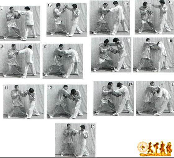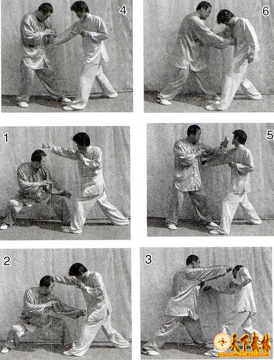 【要点】 蹲身要快,近取裆部要及时、有力,起身右拳掼打要狠。 2、吞身法 对方两脚向前上步,以右冲山炮向我胸部打来,我迅速提气、含胸、收腹,同时左手向下扣按对方右手臂,以对方打不到我胸部为宜;随即左崩山炮向对方面部翻打,然后左脚向前上步,以右冲山炮抖身发力猛击对方胸部,使其内脏损伤(图4~6)。 【要点】 吞身扣手要快速、及时,左拳翻打对方面部要干脆,右拳击胸要有冲击力。 二、晃身闪战 1、左晃身 对方两脚向前上步,以左冲山炮向我头部打来,我上体向左晃身,左掌横推对方左手臂,使对方左拳落空,随即左掌向内反抽对方面部左侧;然后左脚向前上步,以右冲山炮向前猛击对方胸部(图7~9)。 【要点】 晃身要快,推臂及时,反打面部要狠,右拳击胸有冲击力。 2、右晃身 对方两脚向前上步,以右冲山炮向我头部打来,我上体向右晃身,左掌从内向外拨开对方右手臂,使对方右拳落空;随即我左掌顺势前推对方颌关节右侧,使其损伤或脱臼;然后左脚向前上步,身体左转以右卧地炮猛力栽打对方腹部,使其腹部神经丛受到攻击而疼痛难忍(图10~12)。 【要点】 晃身要快,拨臂及时,推颌要狠,右拳栽打对方腹部要有惯性。 三、摆头闪战 1、右摆头 对方两脚向前上步,以右冲山炮向我头部打来,我迅速将头向右侧方向闪摆,使对方右手拳从我头侧打过;此时我左脚向前上步,以左崩山炮向前翻打对方胃脘,使其胃部痉挛;然后两脚向左闪步,以右掼山炮横击对方左侧太阳穴,使其向下栽倒(图13~15)。 【要点】 摆头要快速、及时、协调;上步左崩拳要突然;闪步右掼拳要以腰带劲,具有惯性。