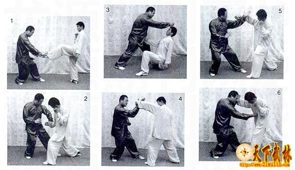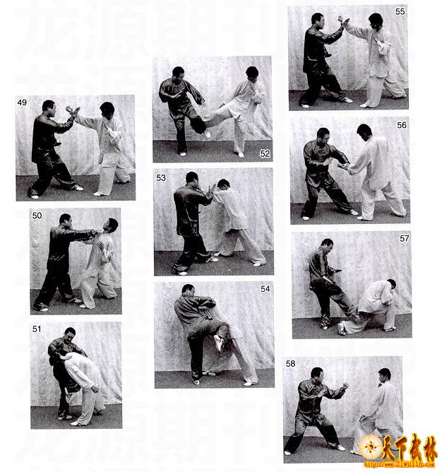 对方两脚突然向前上步,以右劈山炮强取进攻,此时我切不可硬接,以右掌向外横砍对方右手臂,使其产生疼痛;不料对方在手臂受伤的情况下,依然上步进身,以左钻山炮做垂死挣扎,我左掌用力下按,使其不能得逞;随即以右脚向前暗中击打对方风市穴(图55~57)。