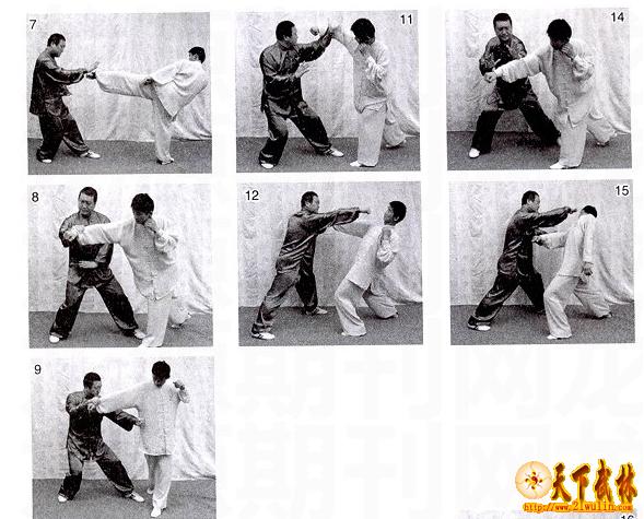 对方以左手向我面部虚晃一招,随即右脚疾步向前,以左脚侧踹踢我胸部,我迅速以右掌向下拍按,迫使对方左腿向下踩落;不料对方右钻山炮紧逼而来,我两脚迅速向左闪步避开对方右拳,顺势抓住对方右手腕向怀中带拉;同时以左崩山炮击打对方章门穴(图7~9)。