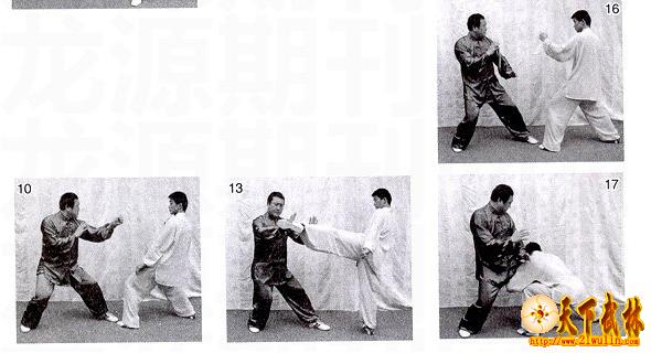 对方以左手向我面部虚晃一招,随即以左脚向我裆部突然发动攻击,我迅速以右掌向下按防;不料对方左脚顺势向下踩落,两手掼山炮同时向我发动攻击,此时我左脚急忙向前上步,双掌同时向外横拨对方两手臂;随即身体稍下蹲,以两掌尖向前击打对方气海穴(图37~39)。