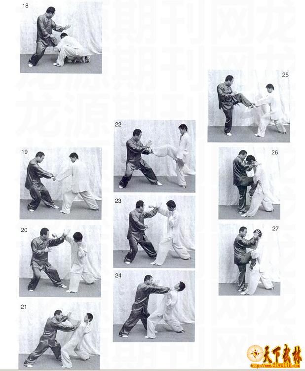 对方两脚突然向前上步,以左冲山炮向我头部虚晃一招;随即蹲身下潜抱住我左腿,欲将我摔倒;此时我重心迅速下移,以左劈山掌击打对方玉枕穴(图16~18)。
