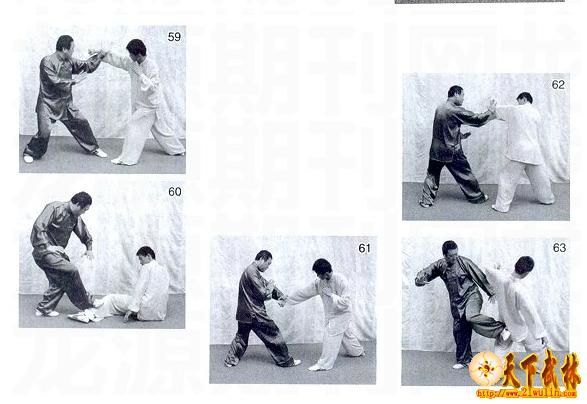 对方两脚突然向前上步,以右冲山炮偷袭我裆部,我迅速以左掌向下按防;不料对方两脚继续向前逼进,以左掼山炮横击我右侧太阳穴,此时我右脚迅速向左闪步,以右掌横推对方左手臂,然后身体向右后转体360度,以左脚跟击打对方环跳穴(图61~63)。