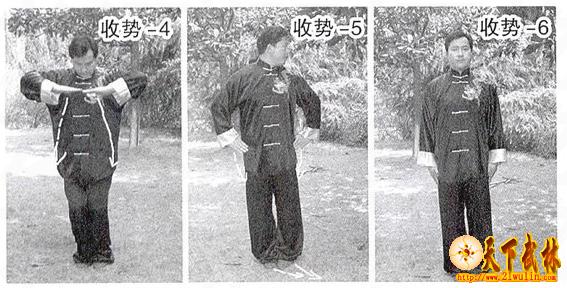 稍停,左脚向左前方上半步,右脚向左脚并拢成并步;同时,手臂放松自然下垂,目视前方。(图收势-6)