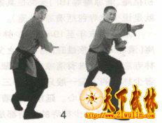 接上式,吸气,提左脚于右腿前,落脚震步,身法随步法之旋转而内裹,双手逆时针画圆于胸腹前,重心在左腿,目视右肩前方(图4)。
