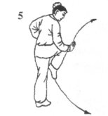 (1)左脚尖稍外展,上体左转约45°,身体重心移至左腿;右腿屈膝在身前提起,脚尖内扣下垂于左大腿前,脚面绷平。同时,右拳变柳叶掌小臂内旋,以掌背向下、向左抄挂至右膝前外侧,掌心向下,掌指斜向前,上体略前倾。目视右掌(图5)。