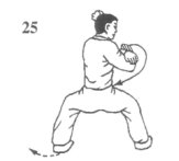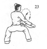 承上动作;右脚至踹击点后,迅速收回,在身体右侧落步,两腿屈膝下蹲;同时,左拳臂外旋成仰拳回收,经腹前时,变成仰掌右伸至右膝前上侧,掌指向右,上身同时左转约45°,右拳随身体左转下沉之势抡臂下砸,将至右膝时,拳臂迅速内旋成俯拳或立拳猛力砸在左掌心上;拳至砸击点的瞬间,两腿屈膝半蹲,大腿接近水平,膝和脚尖在同一方向,脚趾抓地用力外撑成骑马步;右拳砸响后停于右膝外侧,拳心向下或向内,头部稍左倾,左掌及小臂同时内旋成立掌弧形推举置于右腿前,掌心向右,掌指高与大腿平;眼看右拳(图23)。