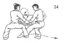 (1)如果乙速起左肘臂架拨我攻势腿,右脚同时向后落步,身形后移下沉欲稳住守势,我则右腿迅速前落低住乙前锋腿,身体随之下沉成骑马步,同时,左手仰掌护住裆腹要位,速用右拳猛力下砸乙中上盘空位或膝关节要位,致乙后倒;目视乙中上盘(图24)。