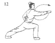 (1)左脚蹬地收提。同时,左拳变八字掌先内收再立掌上挑,掌心由内外翻,以肘为轴,弧形向左立掌外拨,掌指向上;左脚随之前落,脚尖稍外展。目随左掌(图11)。