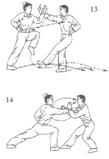(1)如果乙磕开我左拳后,右掌随势向前推击我面部,同时速起左寸腿踢击我前腿胫骨,我则左脚蹬地后提避开乙左寸腿,同时,左拳变掌翻腕上挑乙右掌臂,目视乙攻势手(图13)。