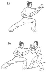 我在乙使用夹挫手时,右拳顺势屈肘内收,使乙夹挫落空,再迅猛发力反臂上崩攻击乙面部空位。乙夹挫落空,则会两小臂交叉用力上架我右崩拳;我目视乙攻防手(图16)。