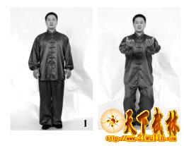 虚领顶劲、沉肩垂肘、尾闾中正、提裆收腹(气沉丹田),舌舐上腭,目视正前方,自然呼吸——无极式(图1)。
