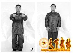吸气,双手掌由两腿外侧(足少阳胆经)缓缓抬起,同时双膝微屈(图2);双手抬至胸前时双手小指向里叼手(图3);呼气,双掌下按至小腹丹田处,双膝微起(图4)。