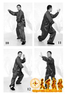 接上式,吸气,身体重心后移至右腿,同时右手野马掌螺旋内收变瓦楞掌收于胸前(图10);左脚掌抬起,以脚后跟为轴点向外转,身法下沉时左手从右肘下抄过,眼随手走,手随身转(图11)。呼气,上右步(图12),身法向右旋转带左掌从脑后耳门推出,重心在右腿,目视虎口(图13)。