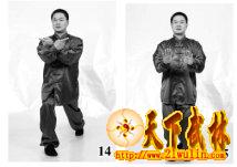 接上式,吸气,屈膝上左步,双手掌在胸前交叉相合,向下顺任脉下按至小腹前(下丹田)呼气——无极式(图14~16)。