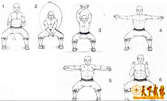 1.马步蹲立,双拳抱于腰间,百会穴与会阴穴成一直线,腰背挺直,舌舐上腭,澄心静息(图1)。