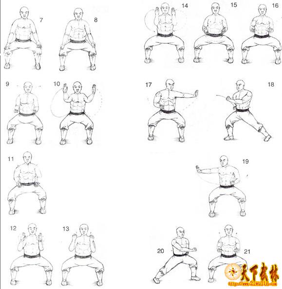 然后,收右拳于右腰间,右腿屈膝成马步,调匀呼吸(图21)。