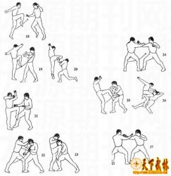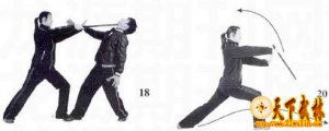 (接上期) 14.顶腹扫腿 我以低姿对敌,敌由前猛扑而来(图36),在其将靠近我身时,我身体重心移于右腿,左腿屈膝向前上方顶敌腹部(图37);敌若向后闪身,我则左脚落地重心移于左腿,左腿屈膝,身体下蹲,双手扶地,并以左脚为轴向右后转体,同时用右脚扫敌腿,使敌倒地(图38)。 【要点 |