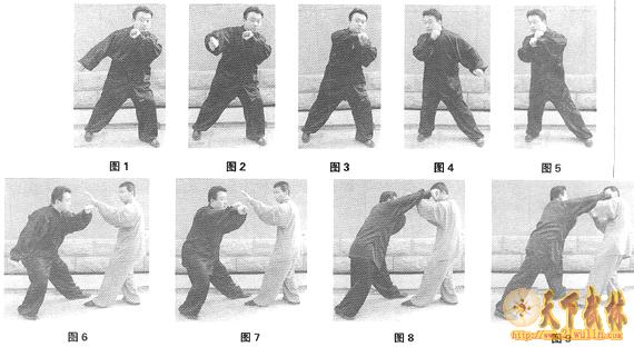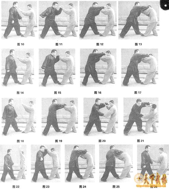 4、敌方抱好间架面向我,随时准备向我发起进攻,我用两手圈锤轮流向他的间架发起猛攻,直逼其左右两侧头、颈、耳门等处,以击中这些部位为目的(图18-21)。