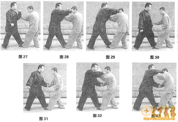 7、敌方用右拳攻击我胸口或腹部,我迅速起左拳用左小臂将其左拳挡在身外,同时起右拳用右手圈锤攻击敌方左侧面颊、左耳门及左颈部(图30-33)。