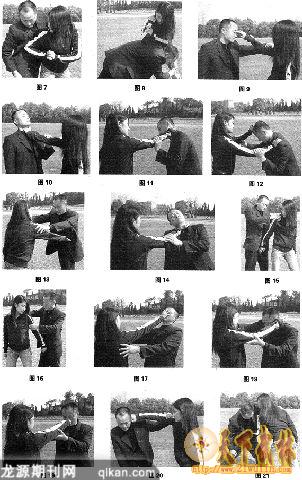 手型变化莫测,可使暴行者难于防范。手可做拳、变掌、化爪,向暴力分子的各个部位攻击。如用二指禅之势向暴徒双眼戳击(图9);五指用力,扼杀对方其喉节,定有实效(图10);用掌砍其颈动脉(图11);手抓住对方头发(图12);用指尖前顶其肋部(图13);用掌横切敌喉部(图14);用掌后拍敌裆部(图15);用手狠抓其“命根”(图16);五指向其面部罩去(图17);双掌齐击敌双耳(图18)。只要将以上的方式向敌袭击,定能起到一击必成功。