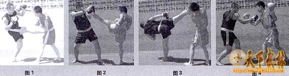 要点与提示:抱接腿有力准确,旋踢快捷,拧腰展胯发力,力达脚后跟及后小腿,意气力相合。旋摆腿踢击时应借对手回抽左腿之力顺势猛踢,必制胜对手无疑。