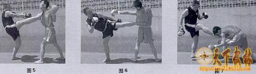 5、双方对峙,对手突然上步潜身用抱腿摔技进攻我,我快速应变,发右后弹腿迎踢对手的面门,使之面部造成重伤,我双手随动体侧,目视对手(图7)。
