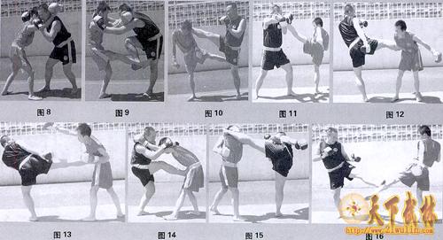 10、双方对峙,对手疾速上步用双手搂抱我的头颈,出左横扫腿破踢我根部施摔技时,我快动出双手反抱对手头部,同时发右前蹬腿狠踢其腹部,使对手受到重创,目视对手(图14)。