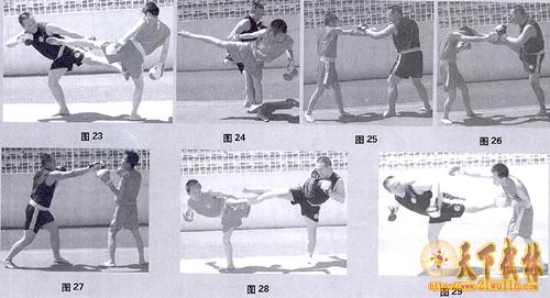 16、双方对峙,对手突发左中边腿攻踢我心腹,我快动上提左膝外挡来腿,接着我连发左低踹腿狠踢对手支撑腿大腿内侧,将其踢翻在地,我目视腿方(图22、23)。
