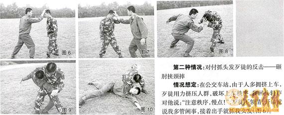 情况想定:在公交车站,由于人多拥挤上车,歹徒用力挤压人群,破坏上车秩序,我回头轻声对他说:“注意秩序,慢点!”,歹徒不领情,开口就说我多管闲事,接着出手就抓我头发(图6)。反击过程:我左手迅速扣握敌右手,避免敌进一步实施攻击(图7);接着,我右手臂迅速上抬,由上向下猛砸敌肘,迫敌下蹲松手(图8);随即,我右脚在敌右后上步,右手臂猛挟敌颈(图9);同时,身体左后转体,将敌摔倒制服(图1O)。