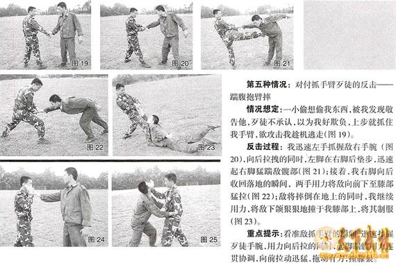 第五种情况:对付抓手臂歹徒的反击一踹腹抱臂摔