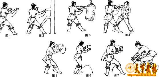 3、吊袋练习:面对吊袋手臂站立,双手轻轻推动吊袋,在吊袋手臂回摆至面前时,左脚即向左后撤步(或右脚向右前上步)避开吊袋手臂,左腿略屈蹲,右脚蹬地使身势左转后坐;同时左手经面前左拨吊袋手臂,随即刁抓住袋臂端,用力外旋向左后拧拉,右手外旋成仰掌用力向左手前抖托袋臂中段。意力运达两手。目视袋臂前、中段(图3)。要注意体会拧拉抖托袋臂时,袋臂前、中段的动衡感。