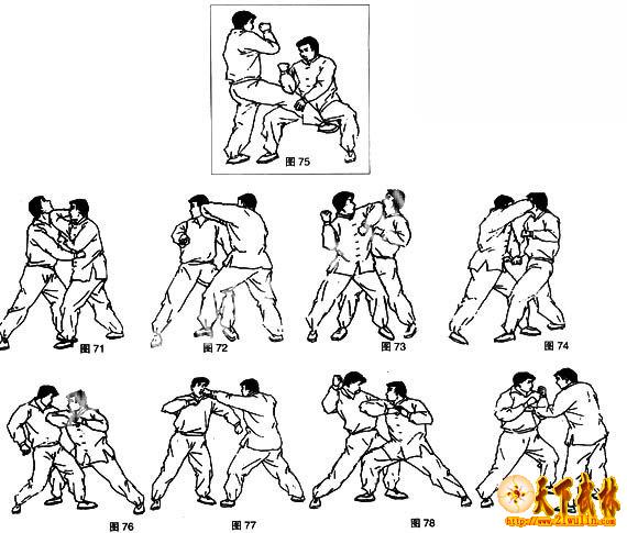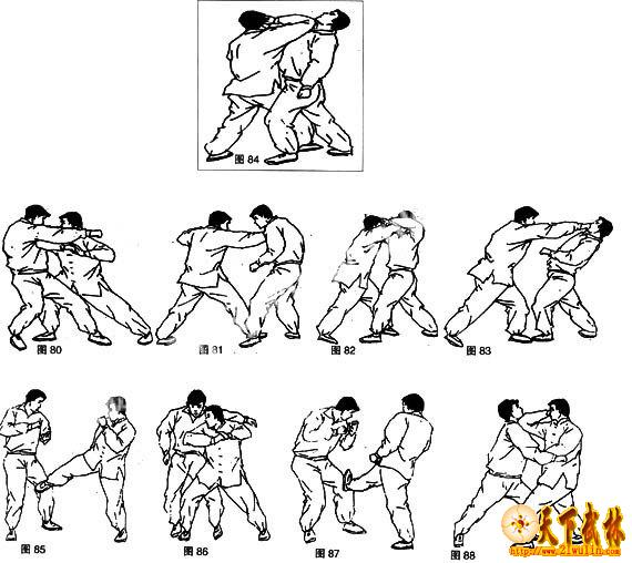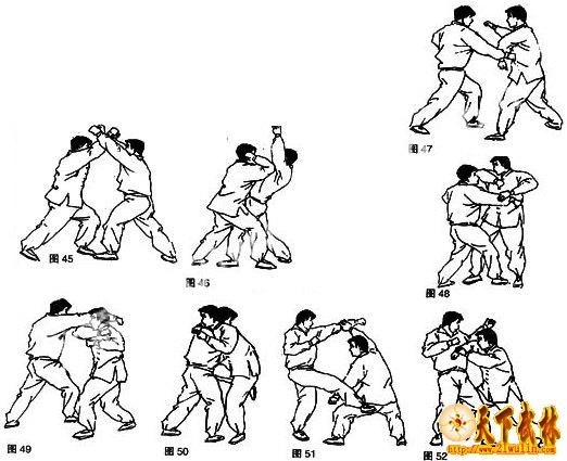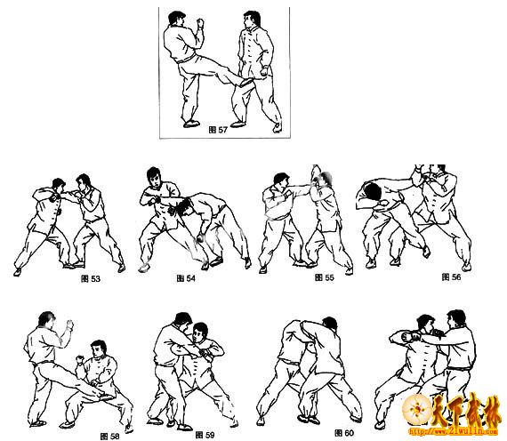 19.猛虎出林 对方右脚前上一步,同时用右直拳向我面部击打;我左脚前上一步,同时用两手向右上捧架对方右拳 (图37)。动作不停,我有手抓握对方右腕向右回领其臂,同时进左脚成马步,同时用左肘顶击对方胸部 (图38)。 动作要点:捧封对方右拳要及时,架领对方右臂前上左脚、与顶击肘要一致,左肘顶击要快速、准确、有力,力达肘尖。 攻防效果:捧架臂可防开对方右冲拳,上左步可挂住对方右腿使其步法不能变化,顶击肘可导致内脏损伤,甚至造成死亡。 20.金蝶采花 对方左脚前上步,同时用两手抓住我胸部衣襟 (图39)。我右脚前上一步,同时用左手按于对方两手掌背上方,将对方掌按固于我胸前,上体左转,同时用右肘向左横击对方左耳部 (图40)。 动作要点:按对方双掌于我胸前要牢固;右肘横击对方头要快速、准确、有力,力达肘尖。 攻防效果:按对方双掌使对方两掌不能变化;顶肘击对方左耳部,可导致对方耳鸣眼花,头晕目眩,甚至造成死亡。 21.金蝉脱壳 对方由我身后,张开双臂,将我后腰连同双臂抱住;我速向外撑对方双臂并向上抬 (图41)。动作不停,我将对方双抱臂解开后,双肘向后猛撞对方两肋 (图42)。 动作要点:外撑臂、上抬臂要及时;后撞肘顶击对方两肋要快速、准确、有力,力达两肘尖。 攻防效果:两臂外撑、上抬,可使对方两臂抱我腰而失效,肘顶对方肋可导致对方肋骨折伤,造成内脏损伤或死亡。 22.双龙戏珠 对方右脚前上一步,同时用两臂向前下抱住我右腿向上提 (图43),我速用两肘向里夹击对方头部 (图44)。 动作要点:左腿支撑要稳,两肘夹击对方头要及时,快速、准确、有力,两肘向里同时用力,力达肘尖。 攻防效果:夹击两肘可使对方头部受伤,导致脑震荡,耳鸣目眩,头昏眼花,甚至死亡。 23.双燕齐飞 对方左脚前上一步,同时用两拳向我两耳部扌贯 击;我左脚前上步,同时用两臂从对方两臂内侧外分并后挂 (图45)。动作不停,我右脚前上一步,同时两臂屈肘向前下顶击对方胸(图46)。 动作要点:挑挂对方双臂要及时,向外用力并后引;上步要快速,双肘前下顶击要迅猛、准确、有力,力达肘尖。 攻防效果:外分臂可防开对方的双扌贯 拳,双肘前下顶砸可导致对方胸受伤,伤及内脏,甚至造成死亡。 24.金鸡抖翎 对方左脚前上一步,同时用右拳向我腹部击打;我左脚在前,同时用左手向外搂开对方右拳 (图47)。动作不停,我右脚前上一步,同时用左手抓握对方右腕向左后领,并用右肘向对方左耳部横肘拐击 (图48)。 动作要点:搂手防拳要及时;上步要快速,上步与拐右肘要一致,拐击对方左耳部要快速、准确、有力,力达肘尖。 攻防效果:搂手可防对方的左拳攻击;拐肘横击对方左耳部可使其头部受伤,导致脑震荡,造成耳鸣眼花,头晕目眩,甚至死亡。 25.狸猫上树 对方右脚前上一步,同时用右拳向我面部击打而来;我向左闪身,躲开其来拳 (图49)。动作不停,我左腿支撑体重,同时用右膝撞击对方腹部,用右肘顶击对方后背 (图50)。 动作要点:闪身躲拳要及时,撞膝、顶肘要一致,顶、撞要快速、准确、有力。 攻防效果:闪身可改变身位和与对方相处的角度,使对方右冲拳失效;撞膝、顶肘可造成对方内脏损伤,甚至造成死亡。 26.罗汉把门 对方左腿支撑身体,同时用右腿向我裆部弹踢,用左拳向我面部击打;我右脚速向右一步,同时用左臂向我搂开对方右腿,用右掌向上挑架开对方左拳 (图51)。动作不停,当对方右腿后抽步时,我右脚前上一步,成为右弓步,左手握住右腕,同时用有肘顶击对方胸部 (图52)。 动作要点:搂手防腿,架掌防拳要及时;上步要快速,右肘顶击对方胸要迅猛、准确、有力,力达肘尖。 攻防效果:搂架手可防开对方拳脚的踢打;上步可绊住对方左腿,使之不能变化;右肘顶击对方胸可导致对方内脏损伤,甚至造成死亡。 27.湘子挎篮 对方右脚前上一步,同时用右拳向我胸部击打;我左脚前上一步,同时用右手向外刁抓住其右腕回领 (图53)。动作不停,我握对方右腕向右后领臂的同时,用左肘向前挑挎对方右肘关节 (图54)。 动作要点:刁抓腕防拳要及时;挎挑其肘关节要反关节,挑挎要快速、准确、有力,力达肘尖。 攻防效果:刁抓腕可防开对方左拳的击打;挑挎肘可导致对方右肘关节被折或脱位,造成其伤残,使之疼痛难忍,不能动弹。 28.韦陀拦门 对方左脚前上一步,同时用左拳向我面部击打;我右脚在前,头向左偏,躲开其拳,并用左手将对方左拳按固于我右肩上 (图55)。动作不停,我右拳上举后屈肘向下砸击对方左肘关节或腕关节 (图56)。 动作要点:偏头躲闪要及时,按对方左手要牢固,下砸肘截对方左腕要快速、准确、有力。 攻防效果:偏头闪身可躲开对方的攻击;按对方左拳可防止对方抽左臂而变化方法;砸截肘可导致对方肘或腕关节脱位,产生剧痛,而不能动弹。 29.合门闭院 对方左腿支撑体重,同时用右脚向我裆部弹踢 (图57)。我两腿屈膝下蹲,同时用右肘向下砸击对方右腿胫骨 (图58)。 动作要点:下蹲要及时;顶肘下砸对方胫骨要快速、准确、有力,力达肘尖。 攻防效果:下砸顶肘可防止对方右腿的踢击,保护裆部。 30.灵猫扑凰 对方右脚前上一步,同时用右拳向我胸部击打;我速前上右脚,同时用左手刁抓住对方右拳腕,并用右肘顶击对方胸 (图59)。动作不停,当对方右脚后退一步,躲我右肘,同时我左脚跟进一步,左肘由左向右横向拐击对方右耳侧 (图60)。 攻防要点:抓腕领臂要及时;顶肘要快