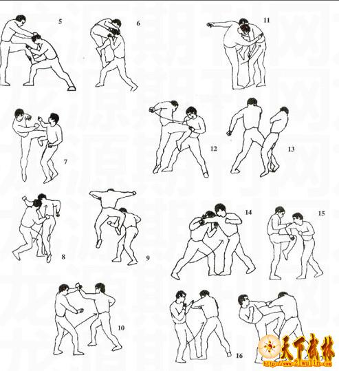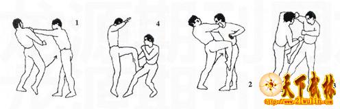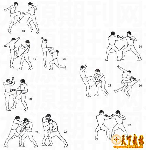 四、猛虎倒山 敌上右步用左拳击我头部,我速用左手向外拨挡,同时右脚向右前方上步(图10);上动不停,我重心移于右腿,身体以右脚为轴向右转90°,同时用左膝向右上方撞敌胸部(图11);敌受击后退,我不待左脚落地,速右膝向上飞起撞敌心窝(图12);我右脚落地后,再以右拳横击敌面部(图13)。 要点:本势要快速、迅猛、协调。左膝攻击时上身向右侧倾,左胯前送;右膝攻击时右脚蹬地要快而有力,身体重心瞬间左移,上身随势向左侧倾,右胯前送。 五、豹子奔川 我以左势对敌,敌上左步用右拳向我左太阳穴横抡而来时,我速蹲身向左侧闪避,右手顺势向右推挡敌右肘(图14);随即,我重心移于左腿,速起右膝顶敌腹部(图15);敌用右手向外侧拨推我右膝,并以左拳横抡来,我右脚向后落步,上身稍后仰,同时用左手向外推挡敌之左肘(图16);接着,我重心移于右腿,速起左膝冲撞敌左肋部(图17)。 要点:本势为一膝攻击受阻,再以另一膝连击之技法,闪避、移身要快速,推挡敌肘要准确、及时,身体与膝击应协调配合。 六、惊龙穿云 我以快速步法靠近敌,至其身前时,我重心移于左腿,速起右膝撞敌腹部(图18);敌向后退步避我右膝攻击,我右脚向前落步,左腿屈膝向前上摆起(图19);上动不停,我右脚用力蹬地,身体腾起,右膝由下向左上方横撞敌头部(图20)。 要点:本势为右膝二次两击,首发膝击一旦被敌躲过,我之进击速度不可减慢,右脚向前落地,即刻蹬地起跳,左膝随势上摆,腾空尽量高,以获得较佳的攻击点。 七、迎风扑蝶 我以右势对敌,敌靠近我身欲用双手抱我腰部,我重心移于右腿,身体以右脚为轴向右转90°,速提左膝向前顶敌腹部,同时左拳由下向前上方勾击敌下颌(图21);敌上身后仰,双手下防我膝,此时我左脚向敌右脚外侧落步,速用右手抓住其头发,左手由右手下按敌左臂(图22);上动不停,我重心移于左腿,右手下拉敌头,同时猛提右膝向上撞敌面部(图23)。 要点:本势首动左膝攻击为虚,意在令敌惊乱,乘机近身施招;右手抓敌发与左手按敌臂要快而准,右膝上撞与右手下拉敌头要协调配合,以加大膝击威力。 八、白猿上树 敌进右步以右拳击我上部,我向右闪身,同时用右手向下截击敌右拳(图24);随即,我重心移于右腿,身体以右脚为轴向右转90°,同时速以左膝向前上方冲顶敌右肋部(图25);敌后退并以双臂阻挡,我右脚用力蹬地,身体腾起,右膝由下向上再向左飞点敌头部(图26)。 要点:左膝击敌右肋,所走路线是自下而上;右飞膝击敌头部,由下斜向左上方;发右飞膝之前,右脚蹬地要突然有力,击出之时腰稍右拧。 九、黄龙搅水 敌进右步用右拳向我胸部击来,我身稍向左转,屈双膝,速用右手向左截挡敌右拳(图27);随即,我身体再向右转,重心移于右腿,左腿屈膝向前上方冲击敌腹部(图28);敌向后退步,我右脚用力蹬地,身体向前上跃起,同时右膝由下向前上方撞敌胸部(图29)。 要点:首动膝击可为虚招,既可阻止敌再次攻击,又为我发右膝攻击创造有利的态势;左膝上提、右脚蹬地起跳并向上冲膝均要瞬间完成,不可迟缓。 十、烈马闯槽 我进左步用右拳击敌面部,敌用左小臂上架我右拳(图30);随即,我重心移于左腿,右拳收回,同时用右膝向前顶撞敌左肋部(图31);敌身左闪并用右肘下防,我右脚向下落步,重心移于右腿,急忙以左膝撞敌右肋部(图32);上动不停,我左脚落地,重心移于左腿,身体稍向左转,同时用右膝撞敌左肋部(图33)。 要点:本势为左右膝连续迫近攻击之法,要求膝击要狠、要快,右膝刚落左膝即发,并注意身体重心的迅速移动及平衡,以利膝法的连击。 十一、鹰捉燕雀 我以左势对敌,敌上右步用右拳向我胸部击来,我速闪身并用右手搂抓敌右腕,左手叼抓其肘关节,身体立即向右转并顺势向右后牵拉敌右臂(图34);随即,我重心移于左腿,身体向左转,速起右膝向前猛撞敌腹部,右手向右下拉带敌右臂(图35);上动不停,我右脚向右侧落步,右手抓敌腕向后拉并用力拧转,左手用力按敌右肩部,同时用左膝向前下跪压敌右膝窝处,将敌擒住(图36)。 要点:右手后拉敌臂与右膝撞腹协调配合,膝击要狠、准;双手擒锁敌臂要牢,左跪膝要突然、准确、有力。 十二、雄狮翻身 敌在身后用左手抓住我左肩欲行凶时(图37);我重心移于右腿,身体以右腿为轴向右后转体180°,双手向后抓住敌两肩并下拉,同时左膝随转体之势猛顶敌腹部(图38);上动不停,我左脚向下落地,重心移于左腿,再提右膝猛撞敌腹部(图39)。 要点:本势关键在于转体要突然快速,双手抓敌肩要快,并与左膝顶击密切配合;左膝攻击要迅猛、有力,才能有良好的攻击效果。 十三、怀中抱月 我左脚在前侧身对敌,敌上右步用右拳向我击来,我速出左手向外格挡(图40);随即,我重心移于左腿,身体向左转90°,同时用右膝向前上方顶敌胸部(图41);敌右脚后退躲避我右膝,并进左步欲攻我上部,我右脚速向后落步,同时右拳防护胸前,左手猛向前穿插敌眼(图42);在敌全神防我左掌时,我两手向前抓住敌双肩并下按,同时用右膝撞敌腹部(图43)。 要点:右膝首击要快速有力,以削弱敌之攻势;左手前插与右脚后落同时进行,协调配合,前插掌要猛而准,迫使敌来不及招架而只能后仰,为我发右膝再创造良机;膝之再击应与两手下按同时进行,二力合一,重创敌身。 十四、飞鹰穿空 我以自然姿势站立,敌在前以低姿与我相对(图44);我突然向前滑步,在适中距离时重心移于右腿,速提左膝向前上方冲撞敌胸部(图45