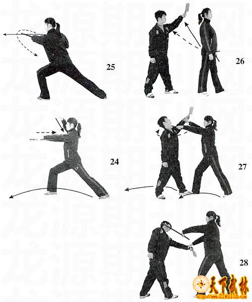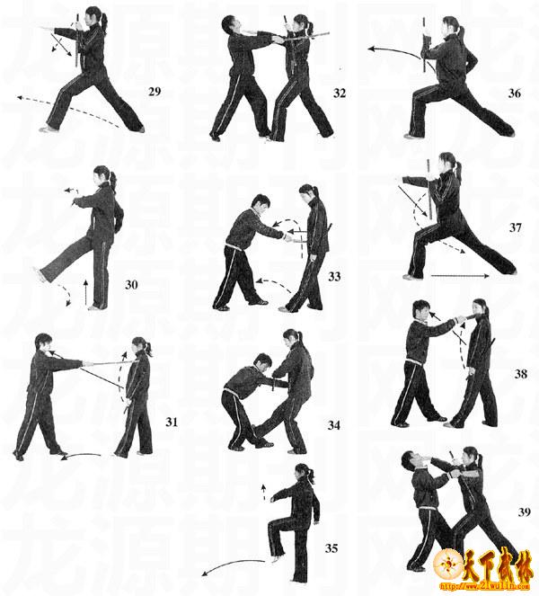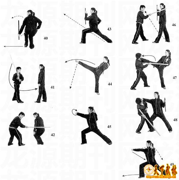(十一)架顶侧击 1、右脚后撤一大步,身体右转90度,左腿膝关节伸直、右腿膝关节弯曲成右弓步;同时右臂平屈肘回收,左手松棍翻腕变掌心向下,于胸前右手虎口前握住棍子;目视左前方。上动不停,身体继续右转90度,右手松棍变拳屈肘上架额前上方,拳眼向下,左手虎口向前,持棍把端向前方顶出;目视前方(图24)。 2、左脚上前一大步,膝关节弯曲成左弓步,左手持棍,棍身紧靠小臂外侧,随身体右转之势平屈肘于胸前,棍头斜指前方;同时右手变掌由头上下落至胸前,掌心向下,虎口向前,与左手虎口相对握住棍身;目视左前方(图25)。 要点:转体要快,动作连贯,上架臂与左手顶棍要同时完成,转体架顶与上步侧击动作衔接要有层次感。 【实用方法】 这是一个防止歹徒从身后偷袭的、防守后连续攻击歹徒的动作。我背面对歹徒,开脚站立,两臂下垂于体前,两手虎口相对握住棍子的一端。当我发现背后有歹徒突然向我攻击时,我迅速后撤右步,右臂屈肘上架,同时左手背棍,提臂屈肘手腕下压,用棍柄向前戳击歹徒喉部;继而左脚向前一步,左臂屈肘(翻腕)用棍子末端侧击歹徒头、颈部(图26~28)。 (十二)压棍截腿 1、下肢不动,左臂随身体左转之势稍外展上抬至肩部高度,右手松棍变掌,掌心向下,手指向前,由左臂下向前伸出(图29)。 2、右手腕外旋,手指抓握成拳并翻腕变拳心向上,由前回收至腰间,左手持棍平屈肘由上向下压至腹前;同时身体重心前移至左腿,右腿抬起,脚尖勾起小腿外旋,脚内侧向前,伸膝关节向前下方蹬出;目视前方(图30)。 要点:右手前伸要用力,握拳旋臂回收身体要向右转,左臂屈肘下压、右手握拳回收和右脚截蹬要同时完成。 【实用方法一】 歹徒双手持械扫劈我身体左侧,我左手持棍竖肘向左侧防出,右手成掌,掌心向下,向前用指尖戳击歹徒的颈喉部位(图31、32)。 【实用方法二】 歹徒右手持刀刺向我胸腹部,我右手前伸抓握住歹徒手腕,外旋回收,左手背棍,屈肘胸前下压在歹徒被反关节的肘关节部,同时提起右脚,脚尖上勾,小腿外旋,用脚内侧截蹬歹徒小腿胫骨(图33、34)。 (十三)外格冲拳 右脚原地向下震脚落步,紧接着左脚提起向前一大步,膝关节弯曲成左弓步;同时左手持棍由腹前屈肘竖起向外格出,右手握拳由腰间向前旋臂冲出(图35~37)。 要点:右脚向前落地后,身体重心要迅速前移;左臂外格挡的幅度不要过大,以防出身体即可,外格挡和冲拳要依次完成。 【实用方法】 歹徒用械击我面部,我左手背棍屈肘上提竖棍于胸前,向左外侧将歹徒器械格挡出去,随即我左脚上前一大步,用右拳击打歹徒面部(图38、39) (十四)退步防下 重心后移,身体右转90度,左脚收回落于右脚内侧,两膝关节屈曲半蹲;同时右拳收回到腰间,左手持棍屈肘内旋经体前向下,伸直肘关节向外防出;目视左前方(图40)。 要点:左脚回收要快,半蹲身时要立腰;左手外格挡的位置要低。 【实用方法】 这是一个防守性动作,我左侧对歹徒,歹徒用腿踢或用械攻击我左小腿时,我迅速收左脚至右脚旁,并屈膝半蹲,左手背棍由前向后将歹徒器械防出(图41、42)。 (十五)边腿摆拳 1、左脚向左前方一大步,膝关节弯曲成左弓步;同时左手持棍由下屈肘向内、向上、向外格出;目视前方(图43)。 2、左膝关节外展,身体重心前移并左转,右腿提起随身体左转之势向右前上方摆踢;目视右前方(图44)。 3、右脚向前落步,膝关节屈膝成右弓步,左手持棍屈肘收回至腰间;右拳由后方向前摆击;目视前方(图45)。 要点:左手竖棍要直,外格挡到一定位置要制动;摆踢腿要以腰发动,以髋带腿,摆踢要有力;右脚向前落步要稳,摆拳力要短促。