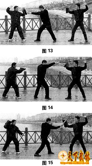 甲方持纸棍以点棍接劈棍向乙方猛力击打(图12、13),乙方速后退两步,但必须保持甲方击中靶位,甲方击中乙方后,突然转身击打丙方(图14、15),丙方迅速后退两步,但必须保持甲方击中靶位,以上练习为一组,反复练习二十组后,三方交换练习。