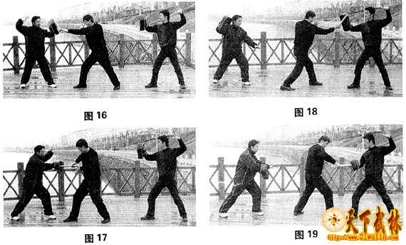 甲方持纸棍以劈棍接刺棍向乙方猛力击打(图16、17),乙方速后退两步,但必须保持甲方击中靶位,甲方击中乙方后,突然转身击打丙方(图18、19),丙方迅速后退两步,但必须保持甲方击中靶位,以上练习为一组,反复练习二十组后,三方交换练习。