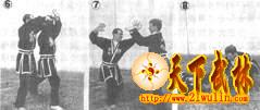 (图6)乙从后面靠近甲并抓住甲的两手腕,甲左腿向后撤一步并向上猛提双手以解除乙的控制。(图7)接下来,甲顺时针方向旋转直到他面向乙,然后,甲迅速锁住乙的左手腕。(图8)这种关节锁定会导致乙的身体下降甚至倒地,甲继续对乙的手腕施加压力,直至将乙牢牢控制在地上。
