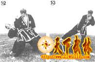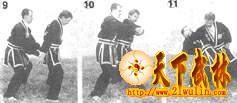 (图9)甲的两手腕从后面被乙握住。(图10)甲左脚向后撤步同时猛提双手“抱至”胸前,用左手解除乙的控制并用左手反握乙的左手腕。(图11)当甲迅速转向乙并在膝盖之上向后猛推乙迫使其身体弯曲时,甲用右手来控制乙的右手腕并实施压力点攻击。(图12)在那个位置,甲还可用右肘攻击乙的胸骨剑突。(图13)当乙倒地时,甲用侧踹击头完成全部动作。