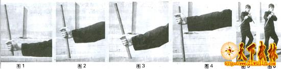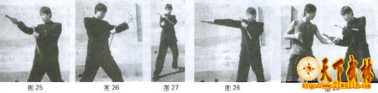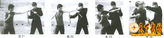1、摊手棍(图25):此技术是咏春拳中的一个代表性技术。手握短棍做此技术可使原技术更有力更具破坏力。此技术如是有咏春基础的人练习只要在原基础上稍加体会一下握棍后的感觉即可,如是没有基础的练习者则需要仔细学习,好好研究一下了。
