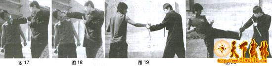 8、连续攻击:在敌我双方相搏斗时,如果我方先攻击敌方。对方遇攻击,不消解就后退,这时我方立即连续攻击,如此必可获得制服对方的效果。连续攻击成功与否的决定因素在于步法,在敌人遭到首次攻击而失形时,切勿使他恢复身体平衡而予以连续的攻击。
