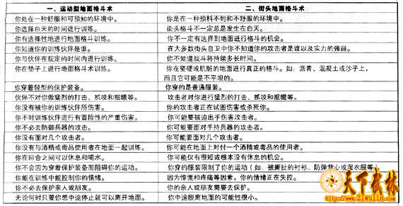 要判断你的体系是否适合真正的街头格斗自卫,请对照下列运动型与街头地面格斗术特征的二项列表: