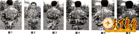 2、动作要领  将歹徒两臂侧抱于胸前,右手腕在其左肩上成抱颈动作,左手腕在右腋下抱背动作:用一根1.5米左右的长绳两端,从其背后上下分别捆住其两侧手腕,使其两腕与躯干固定(图8)。