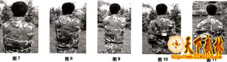 1、动作要领:将歹徒两臂盘抱于胸前,两手腕在腋下夹紧并伸出;用一根2米左右的长绳两端从其后背两侧分别捆住其两手腕,使其两腕与躯干固定(图7)。