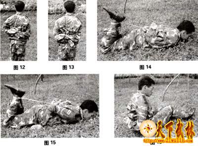 1、动作要领:用一根2米左右的长绳中段,勒住歹徒的颈部前侧,并将两端分别向背后伸到腋下,然后从里向外缠绕数圈捆住其大臂;再将绳子两端的剩余部分分别套住肩背后侧的两根斜绳,与背后捆臂的横绳勒紧扎在一起(图11)。  2、动作要领:要领基本同上,只是将绳子中端打一活结,留在其颈部后侧。先从其颈后向前缠绕,在颈前交叉,再向颈后分别沿伸,捆住其大臂,然后用余绳两端穿入活结的孔向后拉紧。此法既控制其臂又控制其颈部。  3、动作要领:要领基本同上,只是将佘绳两端一头穿过颈后的绳孔向后拉紧:用另一端将其两腕重叠捆住扎牢。然后将两端绳子打成结(图12)。