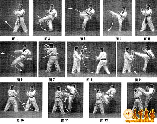 2)起动后攻击腿要迅速随身体旋转踢击目标,两腿膝关节内扣。