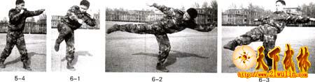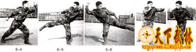 动作要领:在实战姿势基础上,身体前俯,双手变掌,左手由前向右后立臂格挡,手与头同高,右手由上向下向后挡击,自然后摆,左腿微屈站立,右脚脚面绷紧,脚心向后(图6-1),向后向上撩击,脚与胯同高,左手前伸与头同高,右臂自然后摆(图6-2) 身体稍向后仰,左手向下向后拍击,掌心向后,右手向上向后挡击,掌心向前,同时右脚提膝收起,脚面绷直向前弹蹋,脚与胯同高(图6-3),右脚落地顺势左转体90度,左臂向左格挡(图6-4),起右脚用右中边腿向左蹋出,脚与胯伺高,右手自然后摆(图6-5);迅速收回右脚在左脚跟后落地,左腿提膝抬起,用脚后跟着力向后蹬,力达脚跟,右手由下向上立臂格挡,左手自然后摆(图6-6);身体左转90度,同时左脚落地,咸实战姿势(图6- 7)。